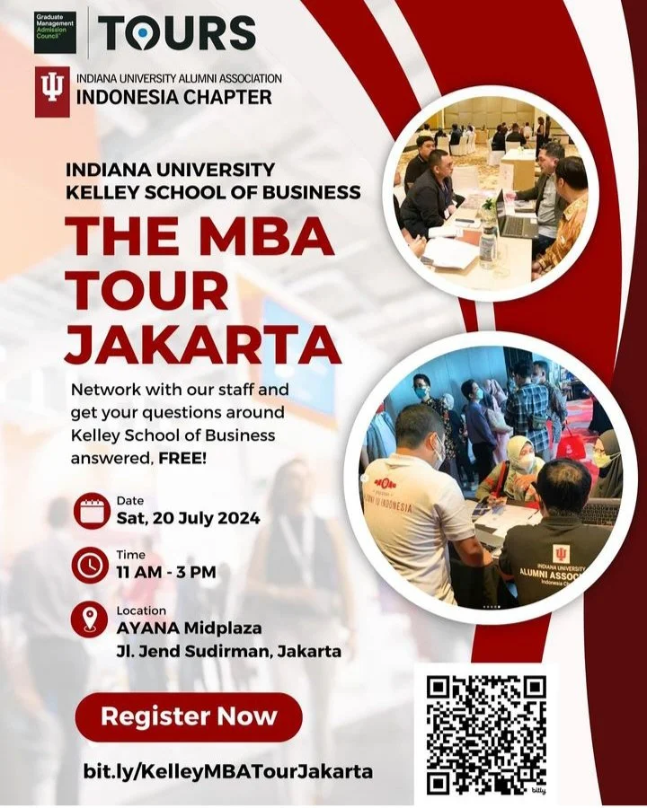 Join us at The MBA Tour Jakarta on Saturday , July 20, 2024 to discover the renowned MBA Program offered by the Kelley School of Business. This is a unique opportunity to ask any questions you may have and connect with IU alumni. We look forward to seeing you there!